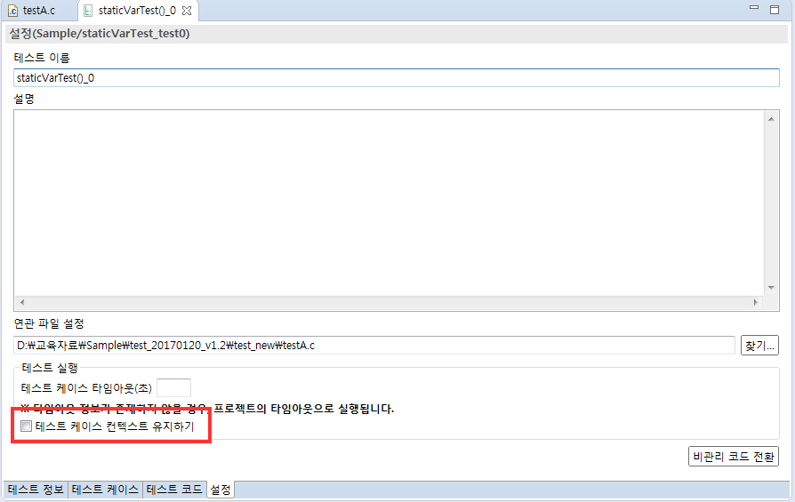 각 테스트 마다 적용하려면 각 테스트의 특성 탭에 [테스트 케이스 컨텍스트 유지하기] 옵션을 체크하고 수행하면 각 테스트 마다 적용할 수 있습니다.