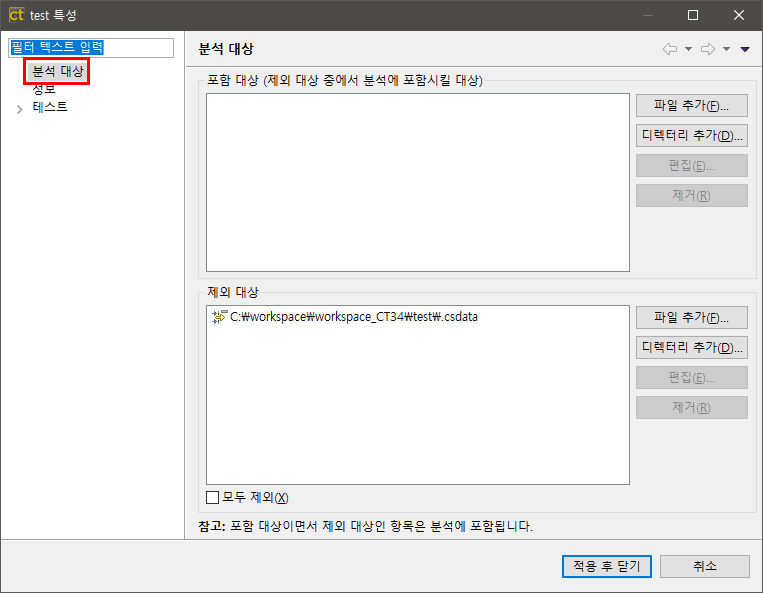 3) 프로젝트 특성 창이 뜨면 [테스트] - [커버리지 측정 제외] 항목을 선택 한 후 제외할 파일 및 함수를 추가