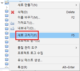 4. 테스트와 테스트케이스를 가져오기 위해서는 프로젝트가 분석된 상태여야 하므로, 프로젝트에서 우클릭하여 '새로 고치기'를 선택해서 분석을 진행합니다.