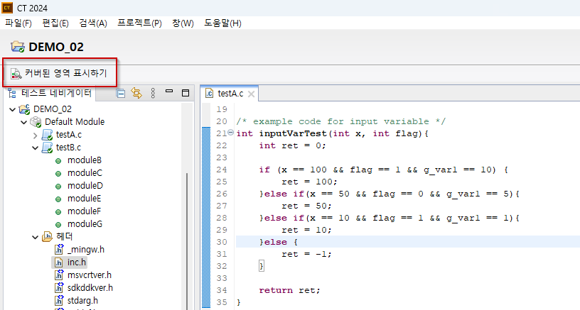 질문 : 유닛테스트 뷰 - 함수, 테스트 또는 테스트 케이스를 클릭하면 소스 테디터 창에 해당 테스트 또는 테스트 케이스가 실행된 커버리지 정보가 소스 에디터 창에 색(붉은색, 초록색)으로 표시되어야 하는데 표시되지 않습니다.