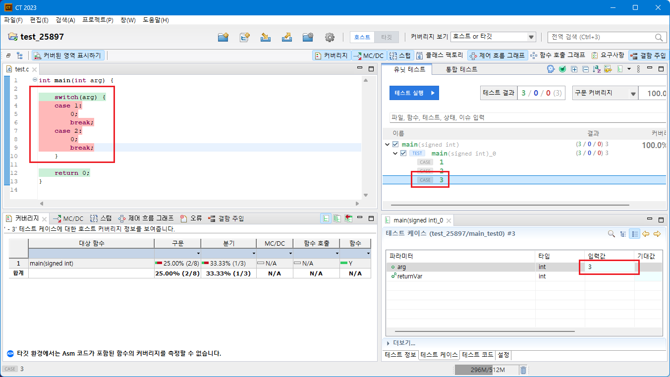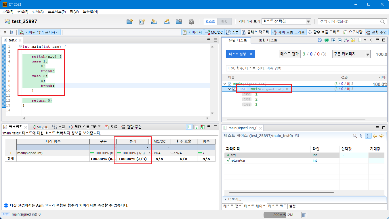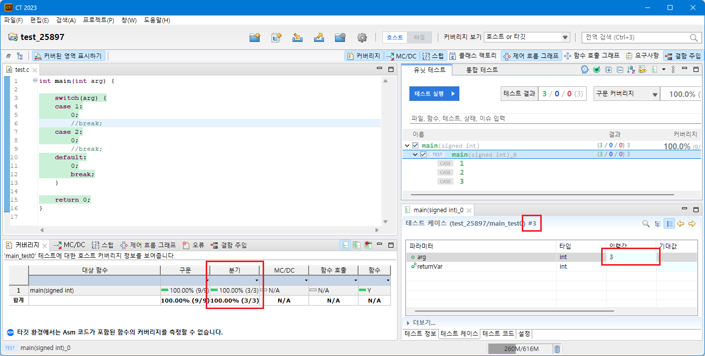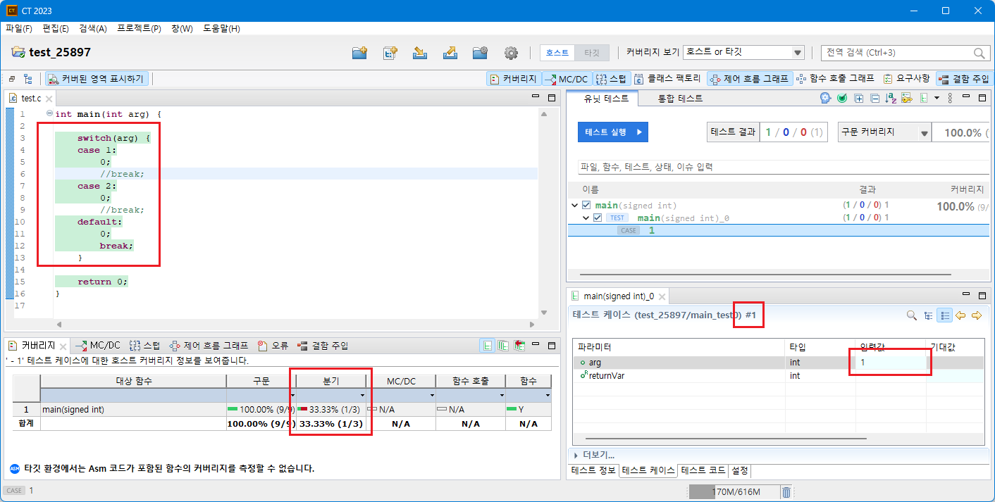 switch() 의 결정에 따라, 특정 case: 혹은 default: 구문으로 바로 진입하는 케이스가 있어야만, 아래와 같이 분기 커버리지가 만족됩니다.